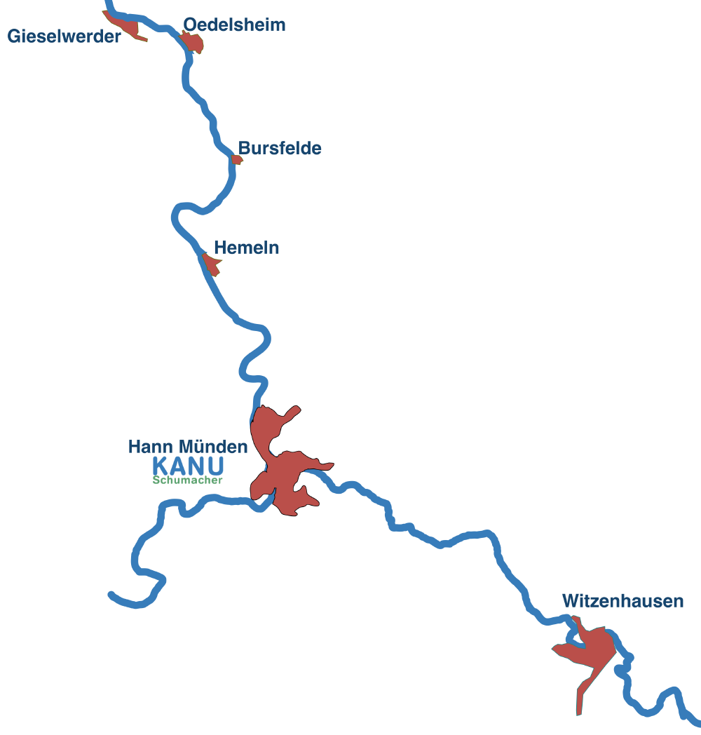 Von hier aus benötigen Sie noch etwa eine Stunde bis Oedelsheim, wo wir Sie nach telefonischer Absprache am Campingplatz in Empfang nehmen. Nach dem Verladen der Boote bringen wir Sie zurück nach Hann. Münden.